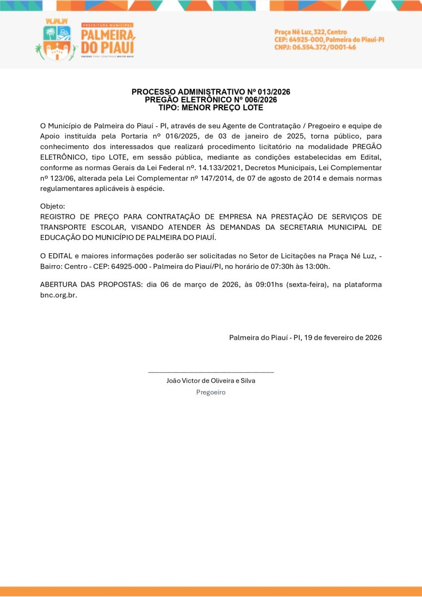 AVISO DE PREGÃO ELETRÔNICO Nº 006/2026
